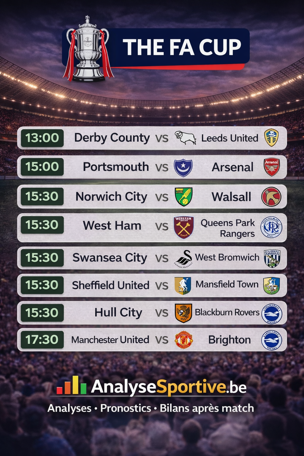 Cette journée de FA Cup propose une belle variété de profils avec des favoris clairs comme Arsenal et Sheffield United, des matchs pièges comme West Ham-QPR et Norwich-Walsall, et des duels équilibrés comme Derby-Leeds et Manchester United-Brighton. La magie de la plus ancienne compétition au monde réside précisément dans ces contrastes et ces incertitudes qui font tout le sel du football.